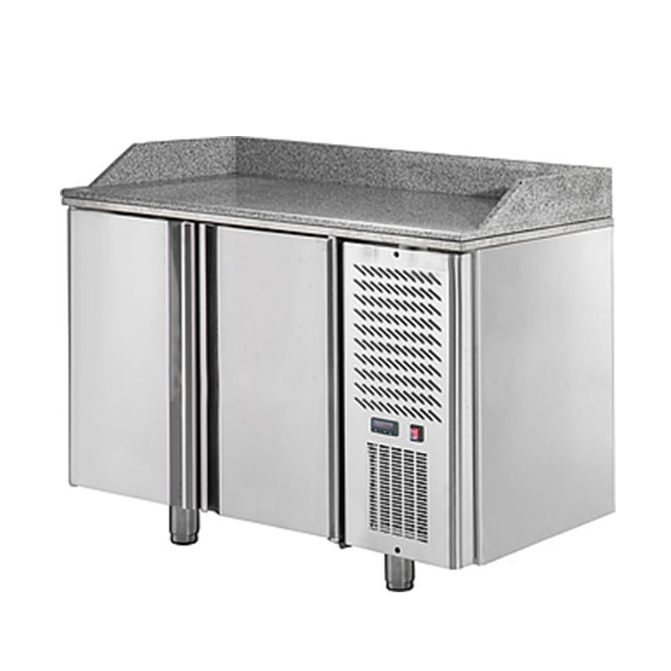 - С трех сторон рабочая поверхность стола ограничена гранитными бортами высотой 150 мм. Такая конструкция позволяет удобно разместить на столах охлаждаемую витрину для ингредиентов (топингов), не занимая при этом пространства столешницы и не мешая работе пиццайоло.