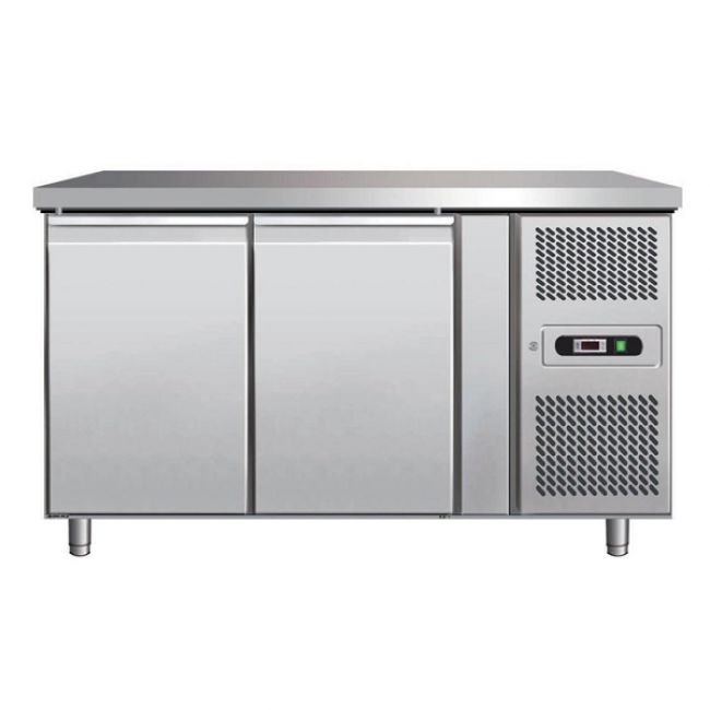 Охлаждаемый стол FORCAR G-GN2100TN предназначен для хранения пищевых продуктов (мясных и рыбных полуфабрикатов, заготовок для салатов, молочной продукции) и напитков. Стол выполнен из нержавеющей стали марки AISI-304, которая полностью соответствует санитарным нормам. Верх стола накрыт столешницей. Имеется две двери для доступа в пространство полезного объема. Внутри стола расположен воздухоохладитель с вентиляторами, которые обеспечивают равномерное и быстрое распределение холодного воздуха внутри полезного объема стола.
