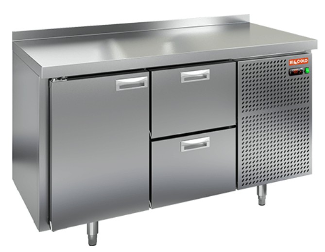 Холодильный стол HICOLD GN 12/TN с боковым расположением агрегата. Электронная панель управления, размер полки: 530х325 мм (GN 1/1), толщина теплоизоляции: 50 мм. Регулируемые по высоте ножки, автоматические доводчики дверей с фиксатором открытого положения, легкозаменяемые магнитные уплотнители. Корпус и столешница из нержавеющей стали.