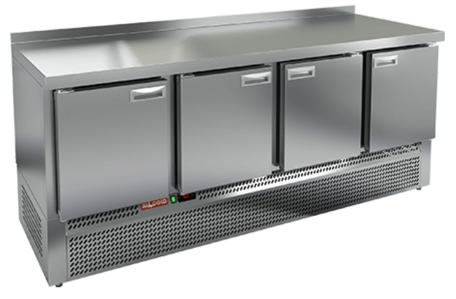 Стол охлаждаемый GNE 1111/TN, с нижним расположением агрегата, толщина теплоизоляции 50 мм, из нержавеющей стали марки AISI 304, высота борта 5 см, 4 распашные двери. Регулируемые по высоте ножки, автоматические доводчики дверей с фиксатором открытого положения, легкозаменяемые магнитные уплотнители.