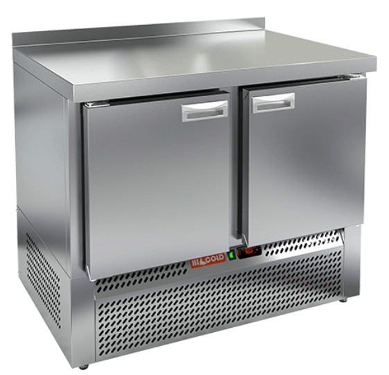 Стол охлаждаемый Hicold GNE 11/TN, с нижним расположением агрегата, из нержавеющей стали марки AISI 304, с бортом (5 см), 2 распашные двери. Регулируемые по высоте ножки, автоматические доводчики дверей с фиксатором открытого положения, легкозаменяемые магнитные уплотнители.