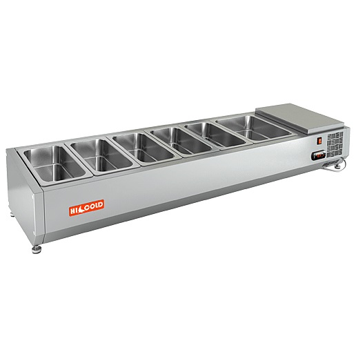 Настольная холодильная витрина HICOLD VRTO 1485 используется на предприятиях общественного питания и торговли для демонстрации, охлаждения и кратковременного хранения салатов, гарниров, закусок и других готовых блюд.