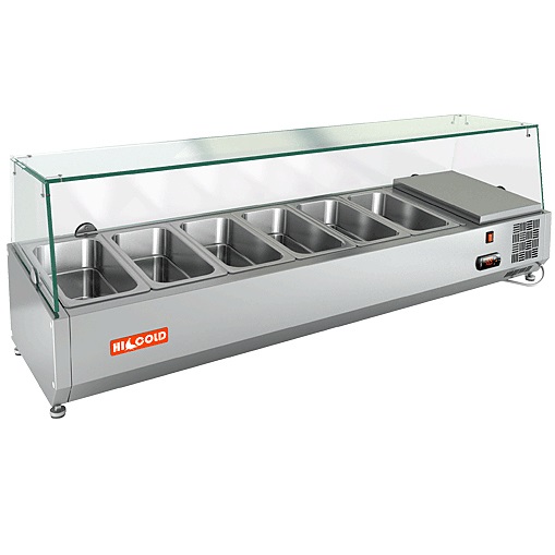 Настольная холодильная витрина HICOLD VRX 1400 предназначена для охлаждения, кратковременного хранения и демонстрации ингредиентов, салатов и готовых блюд на предприятиях общественного питания и торговли.
