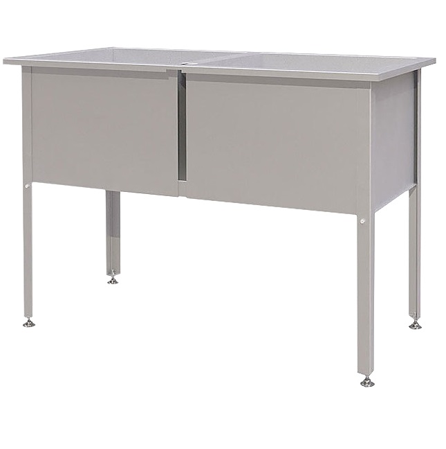 Модель оснащена бортом по периметру мойки и ножками с регулируемой опорой. Каркас выполнен из оцинкованной стали, ванна сварная - из стали марки AISI 430 и опоры стоек - из нержавеющей стали с пластиковой опорой внизу.
