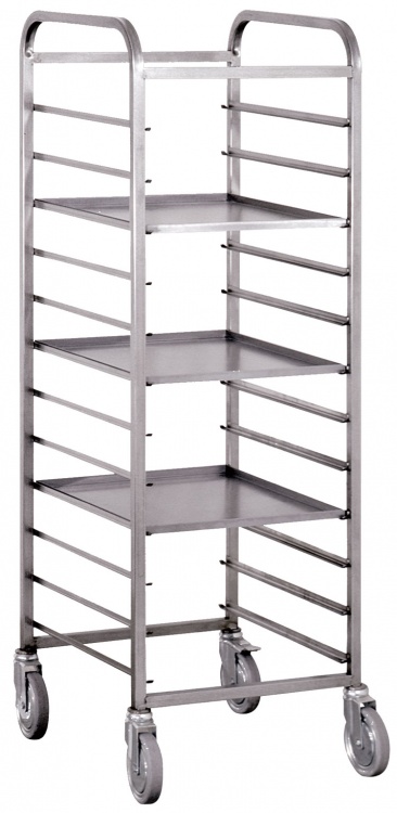Изделия имеют стеллажную конструкцию, выполненную из нерж. стали aisi 304. Передвижение шпилек осуществляется на 4-х поворотных колесах, диам. 100мм, 2 имеют тормозное устройство. Шпилька предназначена для складирования, транспортировки и хранения пекарских и кондитерских противней стандартных размеров 470х580, а также поддонов для духовых шкафов электрических печей. Количество вместимости противней-12 шт.