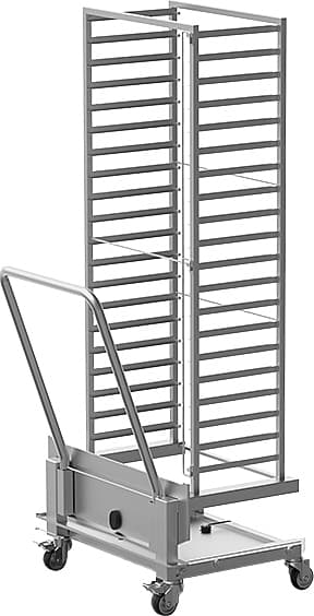 Тележка UNOX XEBTC-16EU используется совместно с конвекционными печами серии XEBC для перевозки гастроемкостей в производственных помещениях.