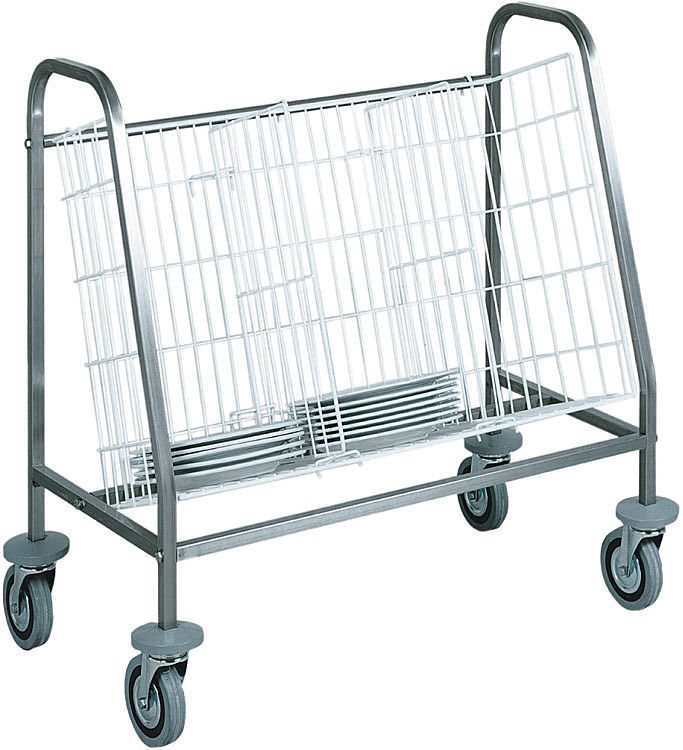 Тележка для сборки, транспортировки, раздачи и хранения тарелок, подносов, лотков и т.д.. Каркас изготовлен из нержавеющей стали. Съемная корзина. Стальные прутья корзины имеют пластиковое покрытие. Вместимость — 100 тарелок. Тележка установлена на 4 колесах диаметром 125 мм. Над каждым колесом установлен круглый бампер.