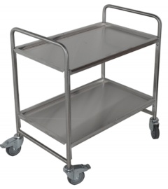 Тележка сервировочная с 2 полками серии ЭКОНОМ предназначена для перемещения на предприятиях общественного питания продуктов, готовых блюд, напитков, и посуды, а ткже для сбора грязной посуды из зала в моечном отделении. Тележки сервировочные имеют прочную сварную конструкцию, 2 полки - глубиной 20 мм и снабжены колесами. Пара колес тележки дополнительно снабжена блокировкой. Грузоподъемность тележки 100 кг. Нерж. сталь AISI 304 - для полок и окрашенный профиль - для каркаса.
