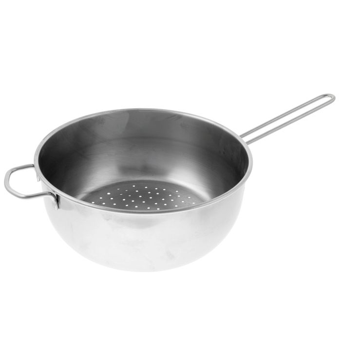 Дуршлаг необходим для промывания ягод, грибов, мелких фруктов и овощей, крупных зерен. Объемный дуршлаг с прутковой ручкой и держателем отлично подойдет для кухонь и столовых школ и детских садов.