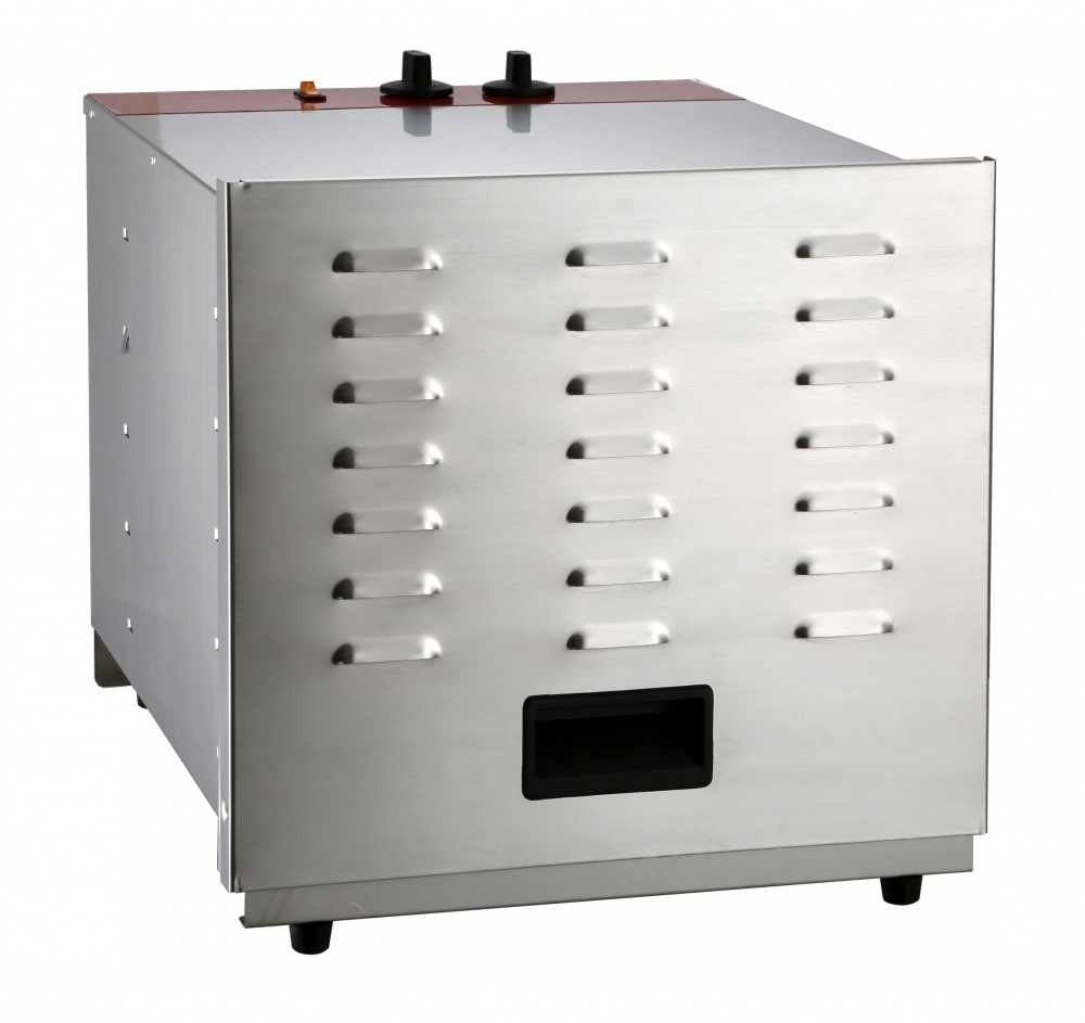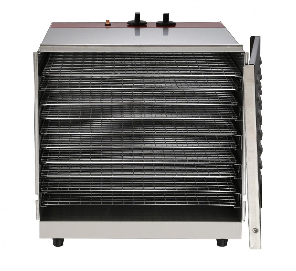 Дегидратор предназначен для равномерного извлечения влаги из продуктов, в данной модели посредством конвекции. Используют для сушки: овощей; фруктов; грибов; ягод; трав; орехов; а так же для приготовления пастилы, фруктовой пастилы (смоквы), овощных и фруктовых чипсов, хлебцев, сушеного мяса и рыбы. Таймер расчитан на 12 часов.