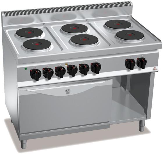 Плита электрическая E7P6+FE, 6 круглых конфорок с электрическим статическим духовым шкафом. Рабочая поверхность и фронтальные панели из нержавеющеи? стали AISI 304. Цельноштампованная герметичная поверхность. Чугунные конфорки с защитным термостатом и переключателем на 6 положении?, включающим 6 различных концентрических зон мощности. Индикаторы контроля напряжения и работы. Статическая электропечь полностью из нержавеющеи? стали с направляющими 4 уровнеи? для решеток/противнеи? 2/1GN. Гриль с функциеи? саламандра в верхнеи? части и термостат, позволяющии? выполнять точное регулирование температуры от 50° до 270° C. Линеи?ныи? индикатор и индикатор достижения нужнои? температуры. Штампованная дверь и контрдверь из нержавеющеи? стали AISI 304. Ручка двери из высокопрочнои? стали AISI 304 толщинои? 20/10. Регулируемые ножки.