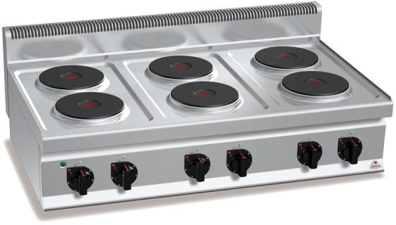Плита электрическая настольная E7P6B, 6 круглых конфорок. Рабочая поверхность и фронтальные панели из нержавеющеи? стали AISI 304. Цельноштампованная герметичная поверхность. Чугунные конфорки с защитным термостатом и переключателем на 6 положении?, включающим 6 различных концентрических зон мощности. Индикаторы контроля напряжения и работы.