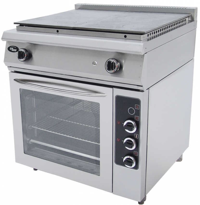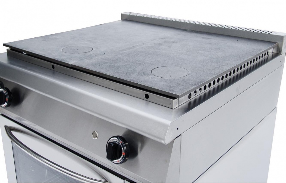 Плита газовая со сплошной поверхностью и духовкой, стальная рабочая поверхнось, 2 специальные горелки, газовая мощность плиты 23 kW, электророзжиг, газ контроль, духовка GN 2/1 из н/стали с таймером и подсветкой: сверху ТЭН 1.5 kW, снизу горелка 4.5 kW полностью из н/стали.