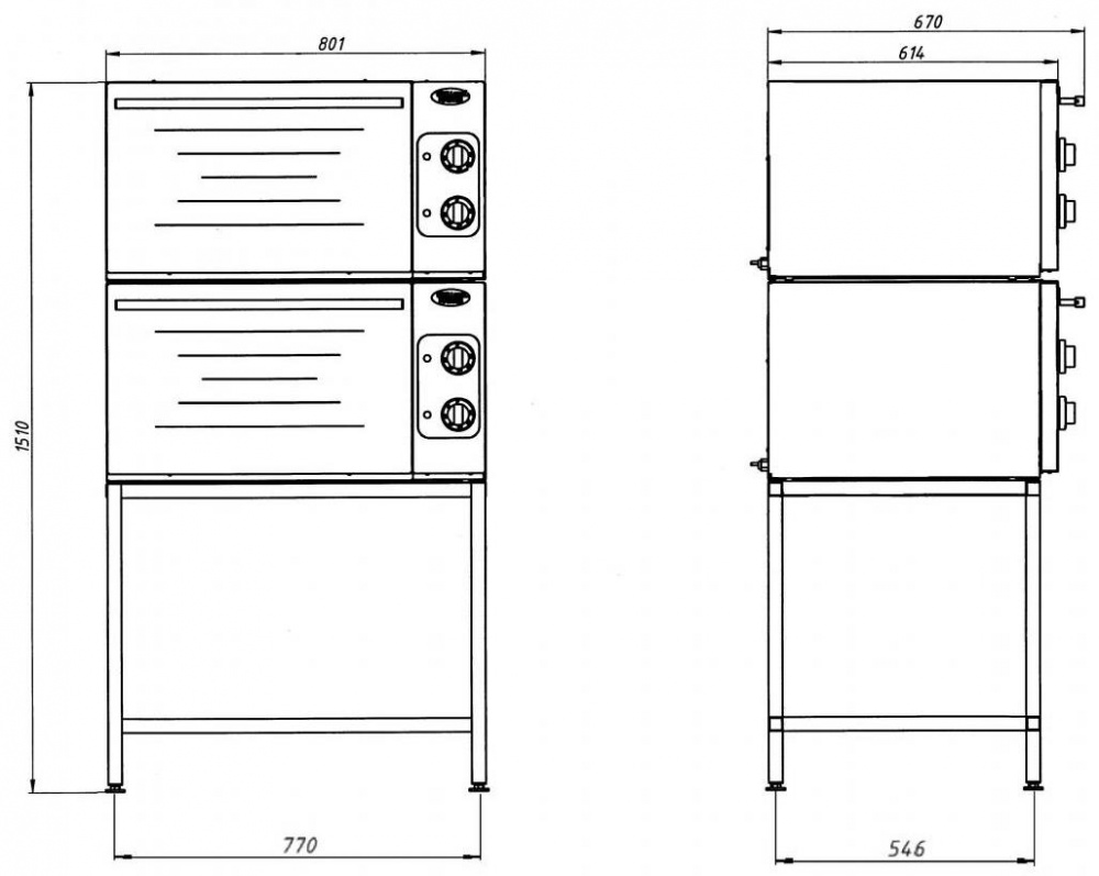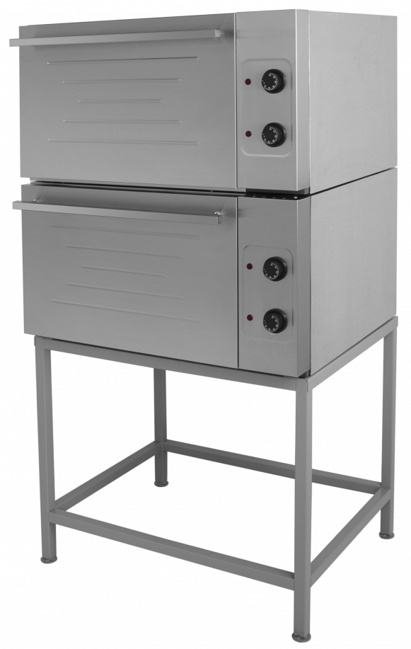 2 модульные секции, 2 терморегулятора на каждый модуль,,4 уровня каждой секции для противней 530x470x30, исполнение - лицевые панели нержавеющая сталь, боковые оцинкованная сталь, в комплекте с подставкой и 6 противнями