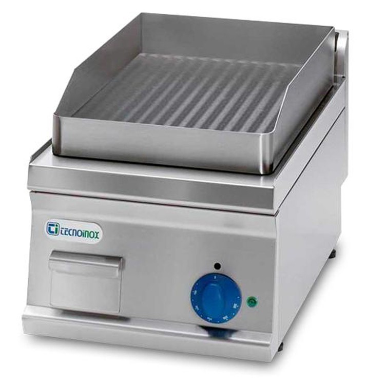 Жарочная поверхность изготовлена из нержавеющей стали. Рифленая поверхность повышенной толщины, герметичная с бортиком с 4 сторон для предотвращения утечки жидкостей. Съемная ванночка для сбора жира с блокировкой против падения. Регулирование температуры 50°-320°C, дополнительный термостат регулирующий чрезмерный перегрев.
