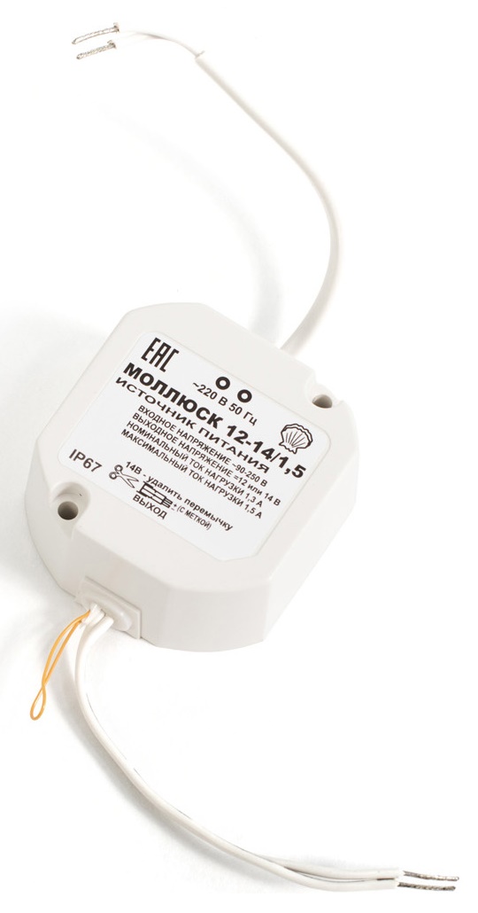 Моллюск12-14 1,5 источник вторичного электропитания; входное напряжение 90...250 В; выходное напряжение 12 или 14 В (выбирается удалением перемычки), максимальный ток нагрузки 1,5 А; световая индикация; защита от короткого замыкания; защита от перегрузки; IP67; 50х49х27 мм; 0,09 кг.