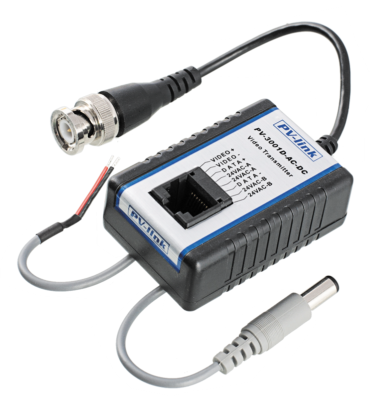 PV-3001D пассивный 1 канальный приёмо-передатчик видеосигнала по витой паре UTP (неэкранированная) с преобразователем переменного напряжения 24В в постоянное напряжение 12В и каналом передачи данных (RS485) грозозащита (сертификат ITU K21 до 4кВ) контакты под разъём RJ45 от витой пары -10°С ~ +50°С 42х58х38 мм.