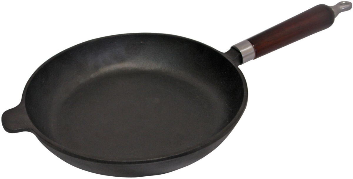 Сковорода чугунная изготовлена из экологически чистого материала. Сохраняет тепло, толстое дно равномерно распределяет температуру. Удобная деревянная ручка, не съемная.