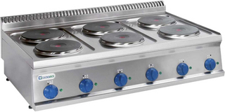 Плита изготовлена из нержавеющей стали AISI 304. 7-позиционные переключатели мощности: 6 шт. Защитный термостат. Приподнятые края для предотвращения выплескивания жидкостей. Ножки регулируются по высоте