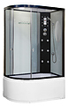 дистанционное (пульт ДУ) управление; угловая, ассиметричная; раздвижная конструкция дверей; вентиляция; гидромассаж; верхний душ; сиденье